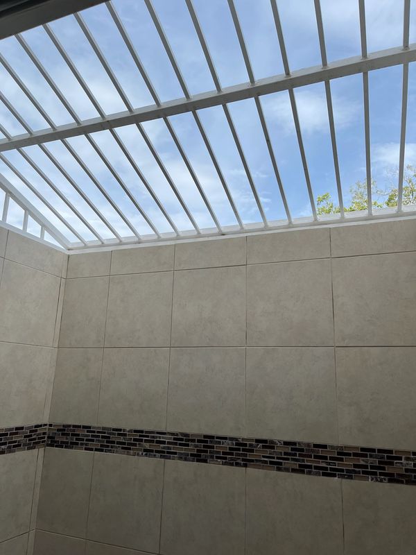 The house has 2 bedrooms each with their own fully attached bath in addition to a 1/2 bath in the hallway. The master shower is open at the top giving you that outdoor showering experience.